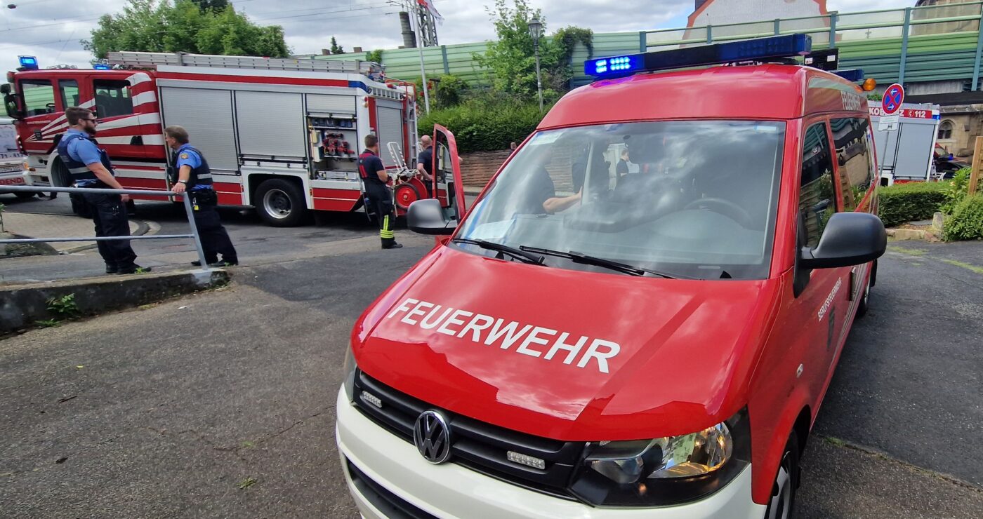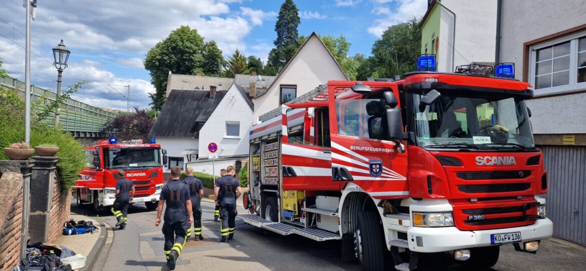 Koblenz-Pfaffendorf | 13. Juli 2023 | (ww). Zu einem Dachstuhlbrand wurde die Berufsfeuerwehr Koblenz heute um kurz nach 12 Uhr nach Pfaffendorf zu einem leerstehenden Haus in die Bienhornstraße alarmiert. Vor Ort stellte sich heraus, dass ein historisches Gebäude, der so genannte „Hof von Umbscheiden“, das Einsatzziel war. Glücklicherweise brannte (noch) nicht der Dachstuhl, sondern es handelte sich wohl um einen seit Stunden schwelenden Brand in einer Geschossdecke. Aber noch viel wichtiger: leerstehend war das Gebäude schon gar nicht – ein laut Einsatzkräften vor Ort „dem Obdachlosen-Milieu“ zuzuordner Mann wurde durch Rauchgase verletzt und musste ins Krankenhaus gebracht werden. Der Schwelbrand an sich war schnell gelöscht – zum Glück. Nicht auszudenken was ein Vollbrand in der für Fahrzeuge zu engen Straße für Auswirkungen hätte haben können. Ein Einsatz der Drehleiter jedenfalls wäre nicht möglich gewesen – „so was wäre sehr mühevolle Handarbeit“, heißt es aus den Reihen der Berufsfeuerwehr, deren Einsatzkräfte bei den aktuellen Temperaturen täglich Außerordentliches leisten. Beim Eintreffen der Feuerwehr waren Fenster und Türen des Gebäudes im Erdgeschossbereich zugenagelt, der Zugang musste erst aufgebrochen werden.
