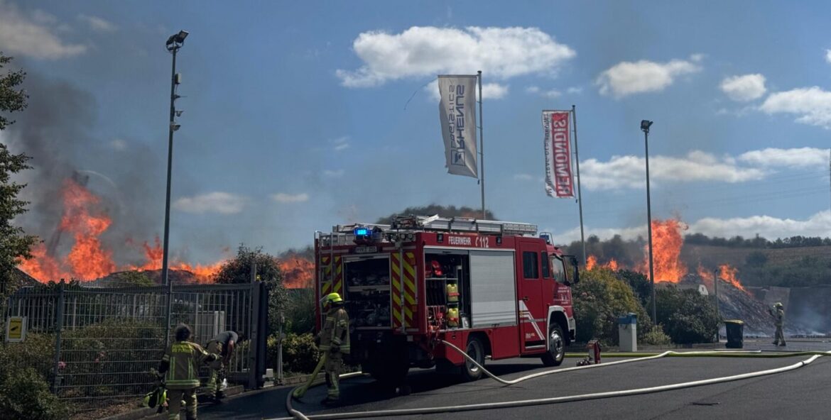 Plaidt | 18. August 2025 | (ww). Im Industriegebiet in der Ludwig-Erhard-Straße in Plaidt läuft seit kurz nach 11.30 Uhr ein Großeinsatz der Feuerwehren aus der Umgebung. Auf dem Gelände einer Recyclingfirma brennen große Stapel, bzw. Haufen mit Holzpaletten. Die Ludwig-Erhard-Straße ist derzeit komplett gesperrt. Der Verkehr auf der nahegelegene BAB 61, sowie der L117 waren nach Polizeiangaben nicht beeinträchtigt. Eine Gesundheitsgefahr durch giftige Stoffe besteht nach Angaben der Feuerwehr nicht. Es wird jedoch geraten, dass Anwohner ihre Fenster und Türen geschlossen halten.