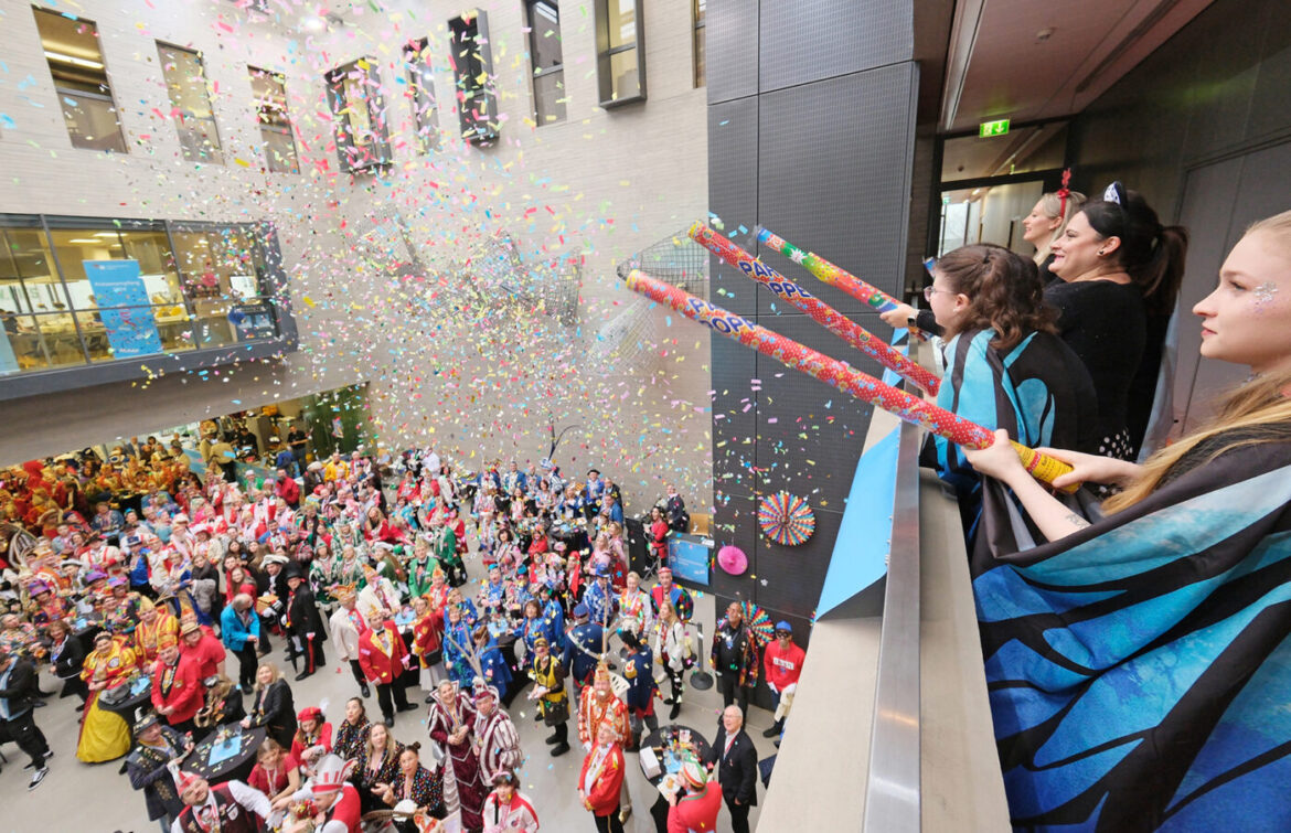 Koblenz | 7. Februar 2024 | (ww). Mehr als 500 Teilnehmer feierten ausgelassen beim traditionellen Prinzenempfang der Handwerkskammer (HwK) Koblenz – ein neuer Besucherrekord, wie das Organisationskomitee der beliebten Veranstaltung heute mitteilte. Pünktlich ab 11.11 Uhr verwandelte sich das Atrium des Zentrums für Ernährung und Gesundheit (ZEG) in einen närrischen Hexenkessel. HwK-Präsident Kurt Krautscheid taufte das Gebäude daher spontan um in „Zentrum für Ernährung und Gesundheit und für Fröhlichkeit“.