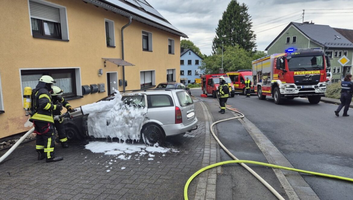 am Samstag-Vormittag in die Hauptstraße nach Rotenhain (VG Westerburg / Westerwaldkreis) alarmiert. Beim Eintreffen der ersten Kräfte stand ein Fahrzeug, das direkt vor einem Mehrfamilienhaus abgestellt war, in Vollbrand. Die Bewohner des Hauses hatten das Haus bereits verlassen. Sofort wurden mehrere Angriffstrupps unter Atemschutz mit Strahlrohren eingesetzt, um die Flammen zu bekämpfen. Da das Feuer, insbesondere unter dem brennenden PKW,