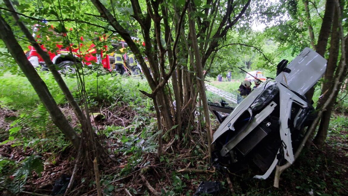 Schweighausen | 7. Juni 2025 | (ww). Auf der L 332 zwischen Schweighausen und Nassau kam es am Samstagabend (wahrscheinlich) gegen kurz nach 18.30 Uhr zu einem schwereren Unfall. Ein 23-Jähriger kam mit seinem BMW am Ende einer langgezogenen Linkskurve nach rechts auf den unbefestigten Seitenstreifen, und verlor dann offenbar beim Gegensteuern die Kontrolle über das Fahrzeug. Es stürzte auf der linken Fahrbahnseite mehrere Meter die Böschung hinab und kollidierte schließlich mit einem Baum. Beide Insassen, der 23-Jährige Fahrer und seine 17-jährige Schwester wurden im Fahrzeug in Schräglage eingeklemmt. Besonders fatal: Da das Fahrzeug weit unterhalb der Straße im dichten Bewuchs zum Liegen kam, konnte es von der Straße aus nur sehr schwer wahrgenommen werden. Zusätzlich gibt es im Umkreis der Unfallstelle keinerlei Handyempfang, sodass das Geschwisterpaar längere Zeit, schwerverletzt, im Fahrzeug gefangen war und nicht um Hilfe rufen konnte. Schließlich gelang es der Beifahrerin gegen 19 Uhr eine Autofahrerin durch Hupen auf sich aufmerksam zu machen – diese war nach Angaben der Rettungskräfte vor Ort glücklicherweise auch noch durch die berufliche Tätigkeit im Gesundheitswesen erfreulich versierte Ersthelferin.