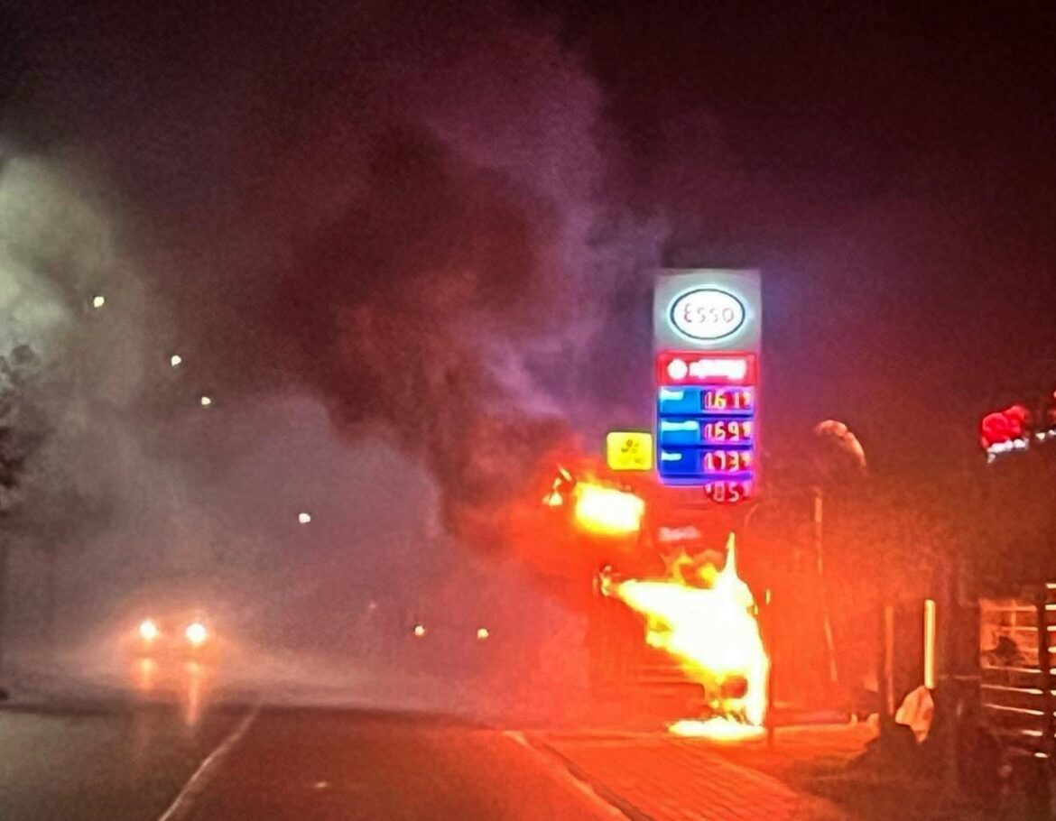 Hahnstätten | 21. Dezember 2023 | (ww). Gestern Abend, kurz nach 18.30 Uhr ist in Hahnstätten ein Linienbus in Brand geraten. Brisant dabei war der Ort an dem der Bus Feuer fing: die Esso-Tankstelle in der Aarstraße / B54, mitten im Ort.