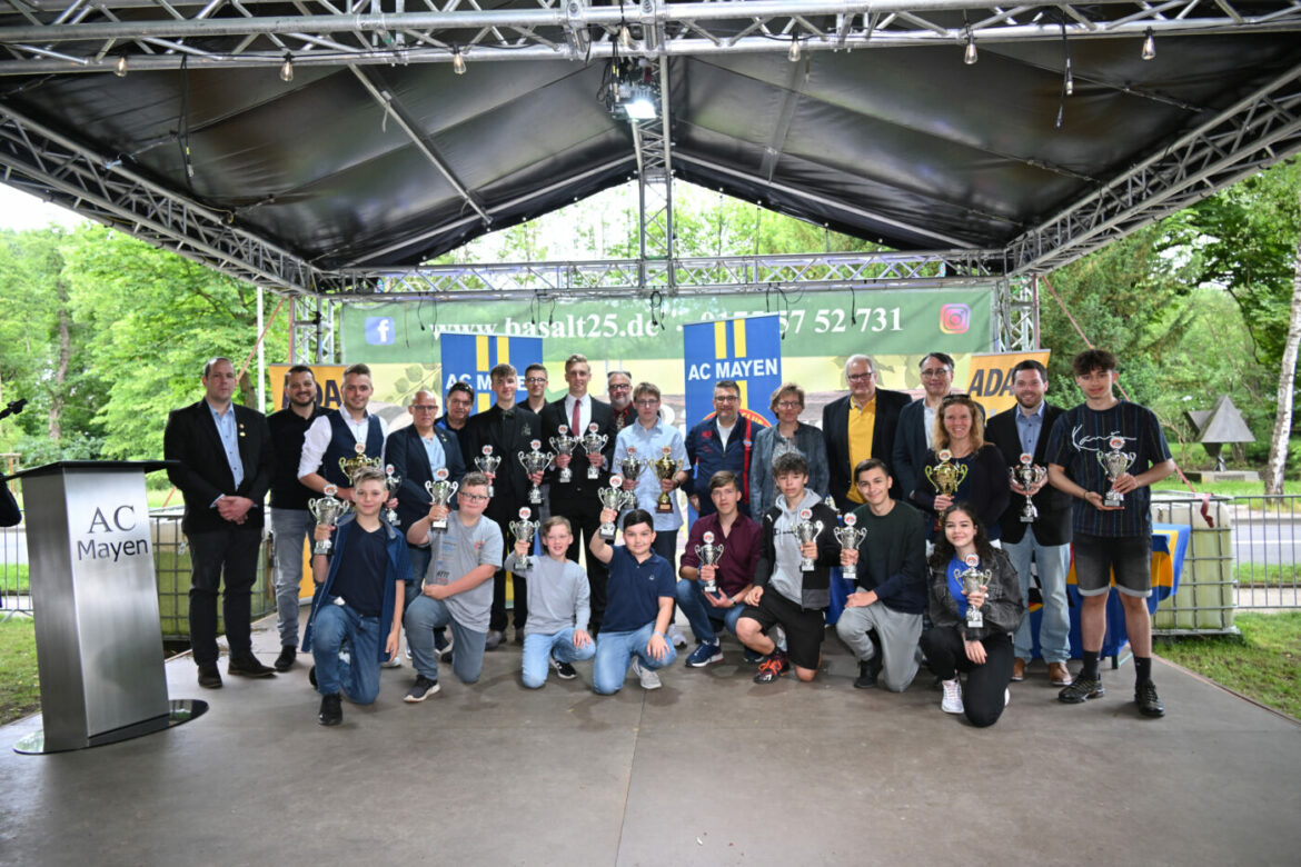 Mayen | 7. Juni 2022 | (cm). Nach der coronabedingten zweijährigen Zwangspause hat es beim Automobilclub 1927 Mayen e.V. wieder was zu feiern gegeben. Gestern konnte der AC endlich wieder seine Motorsportler ehren. Die Feier fand im BASALT25 in Mayen statt. Nach der Begrüßung durch den 1. Vorsitzenden des AC Mayen Rolf Werner und den Grußworten des Bürgermeisters der Stadt Mayen Bernhard Mauel und Rudi Speich vom ADAC Mittelrhein wurden zahlreiche Pokale durch den Vorstand an die zu ehrenden Mitglieder übergeben.