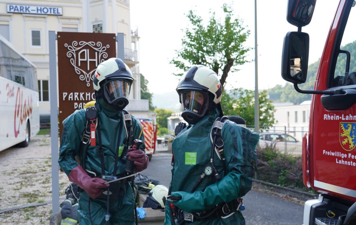 Bad Ems | 30. Juni 2022 | (ww). Gestern abend rund um 19 Uhr heulten die Sirenen gleich mehrafch in und um dieKurstadt Bad Ems. Ab 18:46 Uhr rückte ein Großaufgebot der Feuerwehren des Rhein-Lahn-Kreises sowie weiterhin Kräfte des Rettungsdienstes und der Polizei aus, nachdem im Parkhotel in Bad Ems ein unklarer Chemikalien-Austritt und starker Ammoniak-Geruch gemeldet wurde.