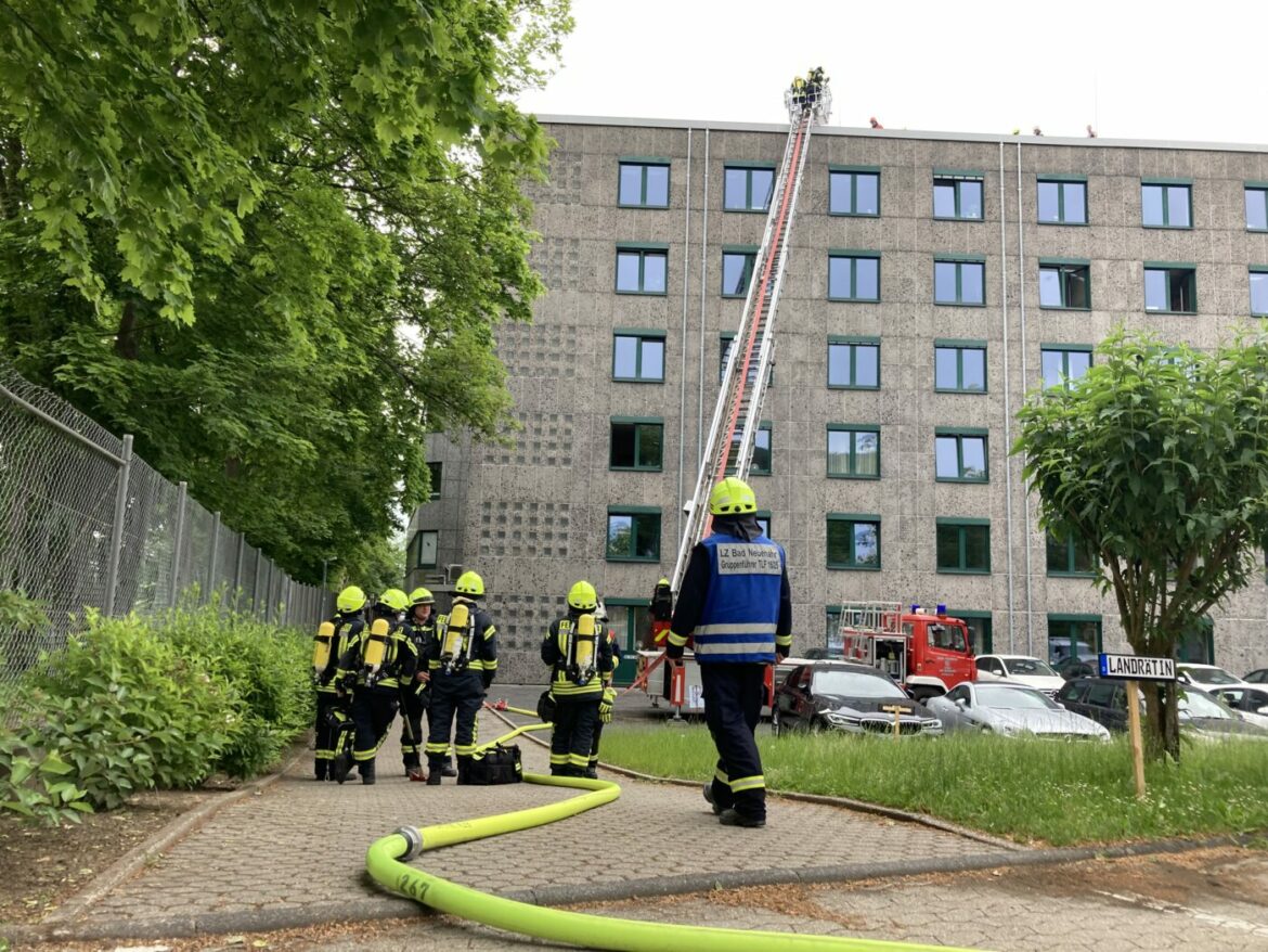Ahrweiler | 24. Mai 2022 | (cm). Aufregung in der Kreisverwaltung Ahrweiler: dort ist am Montag ein Feuer ausgebrochen. Wie die Behörde mitteilte, war es zu einem Brand auf dem Dach der Kreisverwaltung gekommen. Demnach war die Außenansaugung einer Wärmepumpe in Flammen aufgegangen. Ein Spaziergänger hatte das Feuer aus den Weinbergen, die sich hinter dem Kreishaus befinden, entdeckt und die Feuerwehr alarmiert. Die Löschzüge der Freiwilligen Feuerwehren Bad Neuenahr und Ahrweiler waren unmittelbar mit acht Fahrzeugen, darunter auch eine Drehleiter, sowie 40 Einsatzkräften vor Ort, ebenso die Polizei und das DRK. Alle Mitarbeiter und Besucher der Kreisverwaltung konnten das Gebäude unverzüglich verlassen. Verletzt wurde niemand. Nach Angabe des Einsatzleiters Marcus Mandt wurden weder die Dachkonstruktion noch die Dachhaut des Kreishauses durch den Brand oder das Löschwasser beschädigt. Der Betrieb im Kreishaus kann daher fortgesetzt werden.