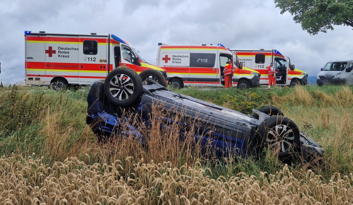 Dachsenhausen/L335 | 26. Juli 2024 | (ww). Zu einem Unfall im Begegnungsverkehr kam es heute gegen 12.50 Uhr auf der L335 zwischen Dachsenhausen und der Kreuzung Kehlbach/Niederbachheim. Auf regennasser Fahrbahn touchierten sich im Kurvenbereich am Tannenhof zwei Fahrzeuge im Begegnungsverkehr. Der fast fabrikneue blaue VW T-Cross war nach Angaben vor Ort in Richtung Dachsenhausen unterwegs, er hatte „noch keine 100 Kilometer auf dem Tacho“. Er kam nach links von der Fahrbahn ab, überschlug sich und blieb auf dem Dach liegen. Das andere Fahrzeug wurde ebenfalls nach links in die abschüssige Böschung abgewiesen. Obwohl die Böschung an dieser Stelle gut fast zwei Meter tief und relativ steil ist, überschlug sich das Fahrzeug nicht und blieb auf den Rädern am Rande eines Feldes stehen.