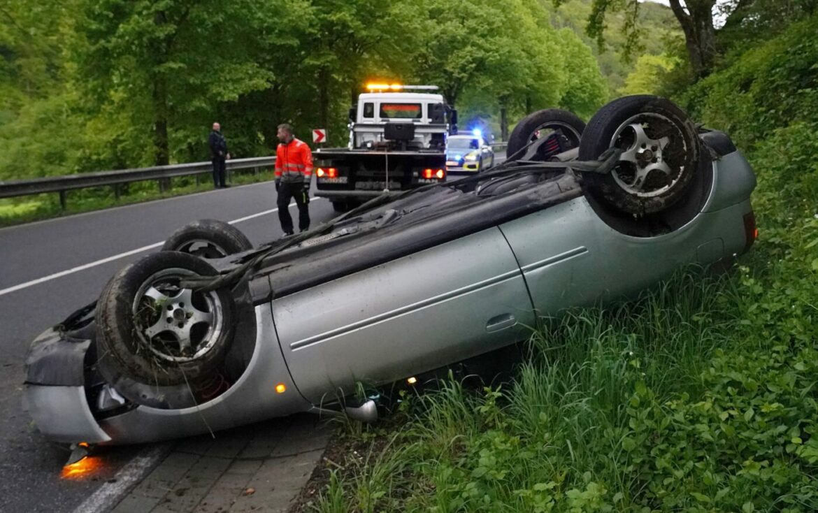 Dausenau/Nassau | 22. April 2024 | (ww). Gegen 18.30 kam es heute zu einem spektakulären Unfall mit glücklichem Ausgang in der Kurve der B260 zwischen Dausenau und Nassau. Der Fahrer eines Audi hat ausgangs der „Krimm“ genannten, starken Kurve auf halber Strecke zwischen Dausenau und Nassau die Kontrolle über sein Fahrzeug verloren. Er war in Richtung Nassau unterwegs, als er in der Kurve ins Schleudern kam, über die Gegenspur hinweg in die Betonbegrenzung krachte und nach einem Überschlag schließlich auf dem Dach liegen blieb. Fahrer und Beifahrer blieben bei dem Unfall glücklicherweise unverletzt, weitere Personen waren nicht im Fahrzeug. Nach Polizeiangaben vor Ort könnte überhöhte Geschwindigkeit Unfallursache gewesen sein. Das Fahrzeug musste durch ein Abschleppunternehmen aus Lahnstein geborgen und abtransportiert werden, es war nicht mehr fahrbereit und dürfte einen Totalschaden haben.