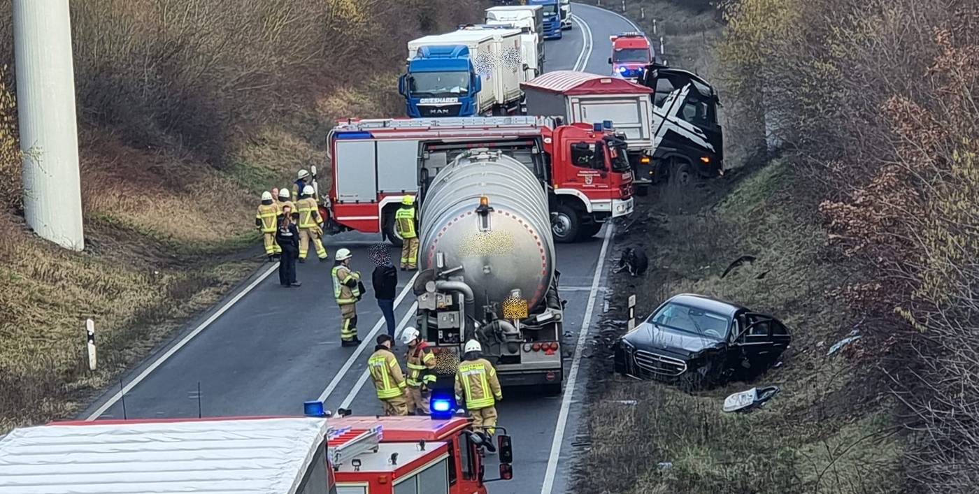 B262 / Mendig-Kottenheim | 18. Februar 2026 | (ww). Heute Vormittag gegen 9 Uhr kam es zu einem schweren Unfall auf der B262 zwischen den Anschlusstellen Kottenheim und Mendig. Beteiligt waren zwei LKW und ein PKW. Nach Angaben des stellvertretenden Wehrleiters der Verbandsgemeinde Mendig, Tim Skubch, waren die beiden LKW hintereinander in Richtung Mendig unterwegs, als sie mit einem entgegenkommenden PKW kollidierten. Dabei wurde der PKW-Fahrer in seinem Fahrzeug schwerverletzt eingeklemmt und musste mit hydraulischem Rettungsgerät durch die Feuerwehr befreit werden.