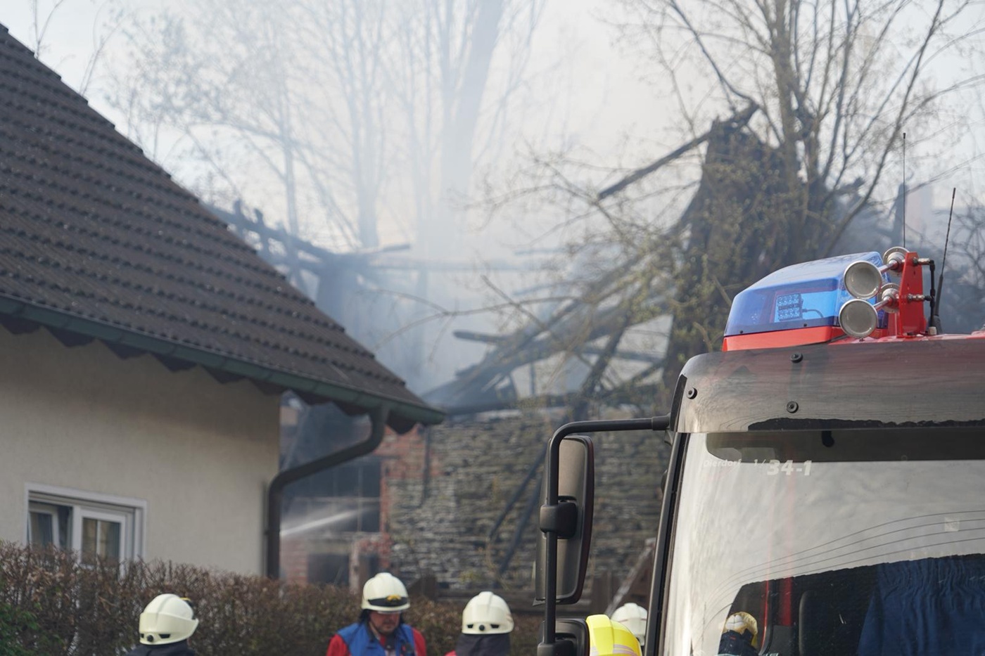 Die Brandbekämpfung erfolgte von mehreren Seiten mit mehreren Strahlrohren. Eine besondere Herausforderung stellte ein unmittelbar angrenzendes Nachbargebäude dar, dessen Dachstuhl ebenfalls in Brand geraten war. Dieser Brand konnte jedoch schnell unter Kontrolle gebracht und das Gebäude im Anschluss gekühlt werden, um eine weitere Ausbreitung zu verhindern. Durch den starken Funkenflug der brennenden Scheune kam es zudem zu weiteren Brandausbreitungen: Auf dem Gelände einer gegenüberliegenden Metzgerei geriet ein Teil eines Daches in Brand. Dieser Brand konnte durch die eingesetzten Kräfte zügig gelöscht werden.