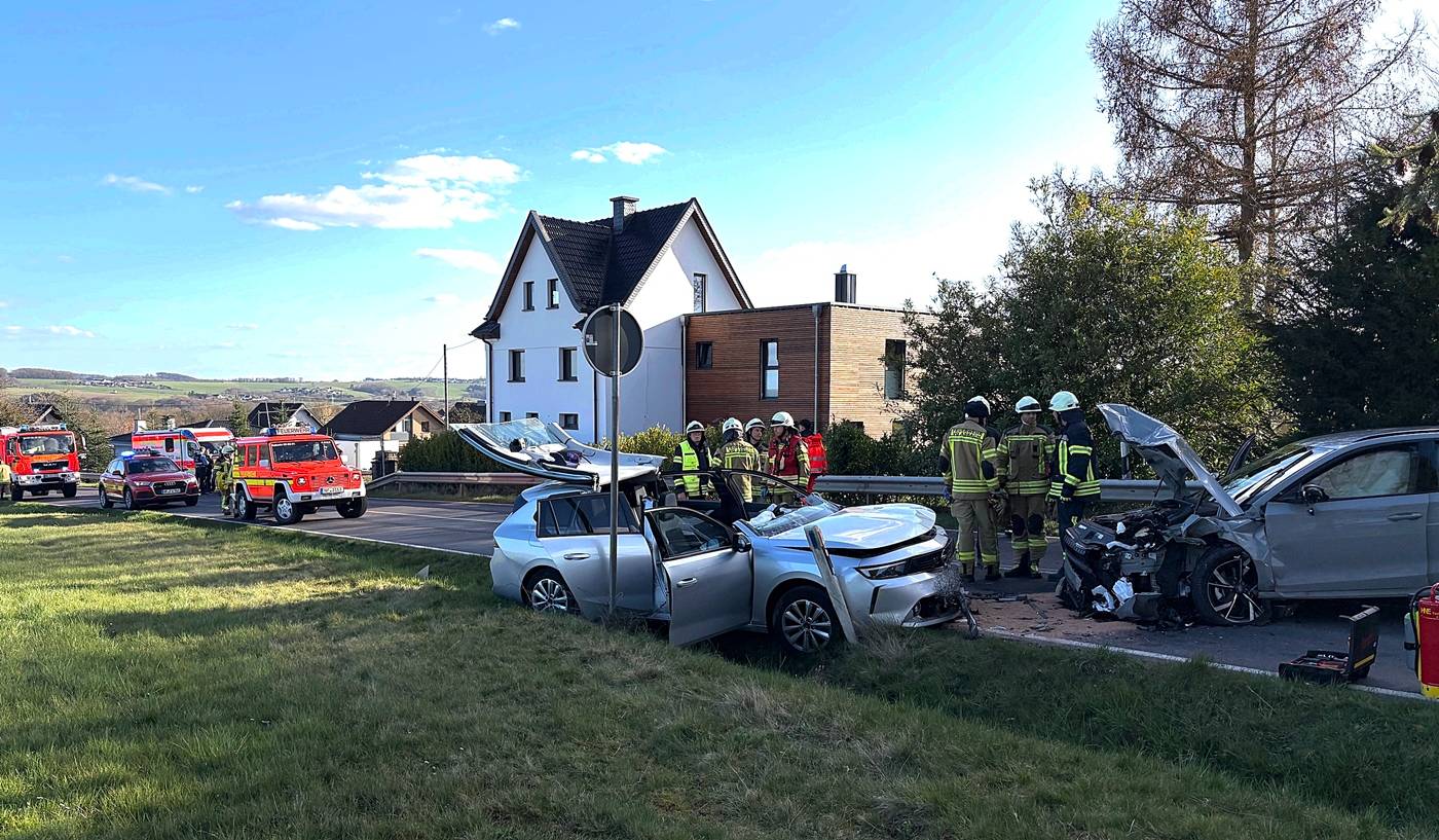 Etscheid | 3. April 2026 | (ww). Bereits am Mittwochnachmittag kam es auf der L255 bei Etscheid, einem Orstteil von Neustadt (Wied) im Landkreis Neuwied zu einem Unfall zwischen drei Fahrzeugen. Dabei wurden vier Personen verletzt und mussten in Krankenhäuser transportiert werden. Die Feuerwehr musste eine eingeklemmte und verletzte Frau aus ihrem Auto befreien. Gegen 17.15 Uhr ging eine automatische Meldung über ein eCall System eines Fahrzeuges nach einem Unfall ein und es folgte ein Notruf, dass es bei Etscheid zu einem Unfall gekommen sei. Sofort wurden Feuerwehr und Rettungsdienst alarmiert. Die ersten Einsatzkräfte an der Unfallstelle fanden zwei Autos vor, die frontal ineinander gestoßen waren sowie ein drittes Fahrzeug etwas weiter entfernt. Durch die Feuerwehr wurden alle Betroffenen erstversorgt und anschließend an den Rettungsdienst zur weiteren Behandlung übergeben. Die Fahrerin eines der frontal zusammengestoßenen Autos war noch im Fahrzeug eingeschlossen. In Absprache mit dem Rettungsdienst wurde zur schonenden Rettung der Verletzten das Dach vom Fahrzeug entfernt. Hierzu kamen hydraulische Rettungsgeräte zum Einsatz. Parallel stellte die Feuerwehr den Brandschutz sicher und nahm ausgelaufene Betriebsstoffe auf. Aufgrund des Verletzungsmusters der Fahrerin wurde ein Rettungshubschrauber nachgefordert. Insgesamt wurden vier Beteiligte in Krankenhäuser gebracht. Darunter zwei Personen leichtverletzt, eine Person mittelschwer und eine Person schwerverletzt. Nach rund eineinhalb Stunden konnte der Einsatz für die Feuerwehren Etscheid und Neustadt beendet werden. Die L255 in Höhe der Ortslage Etscheid musste während der Maßnahmen voll gesperrt werden.