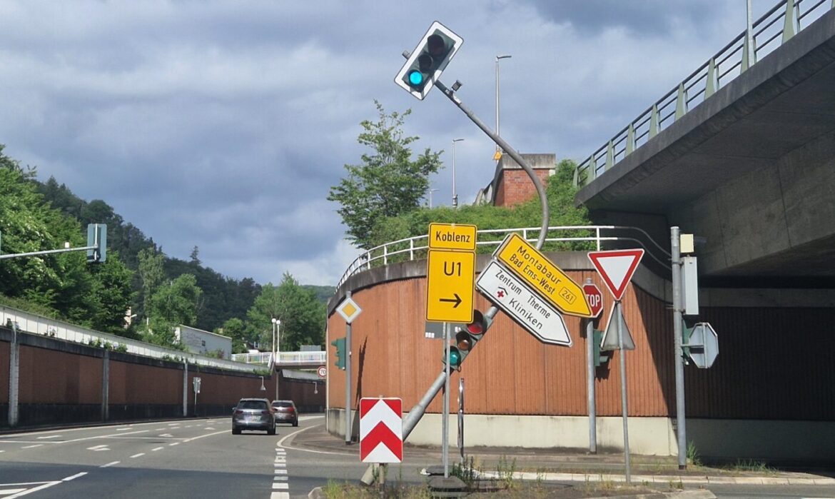 Bad Ems. Am westlichen Tunnelportal des Malbergtunnels in Bad Ems ist heute Nacht gegen 1.50 Uhr ein Mast der Ampelanlage umgefahren worden. Die 56aktuell-Anfrage bei der Polizei Bad Ems ergab: ein LKW hat den Mast heute Nacht beim Abbiegen gestreift und umgedrückt. Im Moment wird um erhöhte Vorsicht bei der Ausfahrt aus dem Tunnel in Richtung Fachbach / Nievern (Lahnstein) gebeten. Die Ampel funktioniert zwar, wie auf dem Bild zu sehen, noch, ist aber aus dem Tunnel logischerweise nun schlechter zu erkennen.