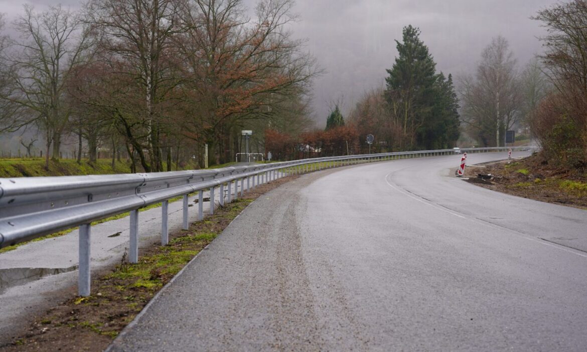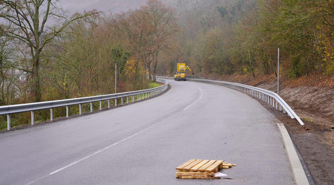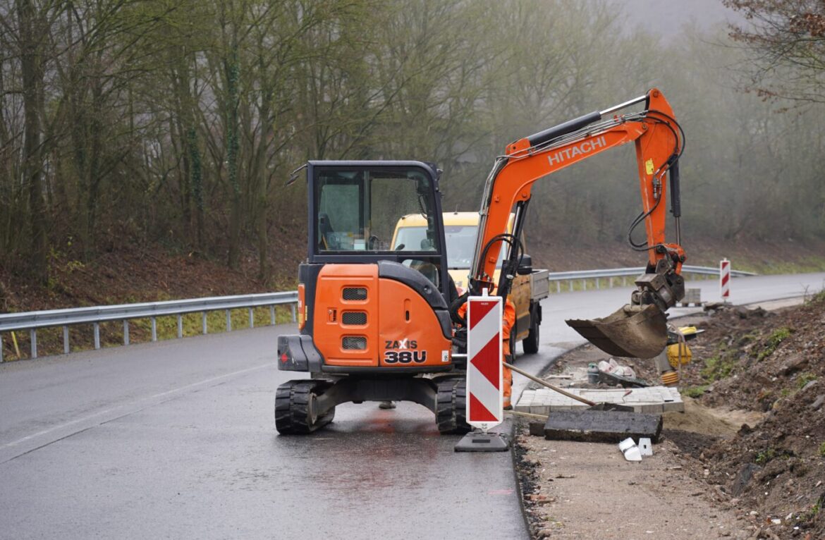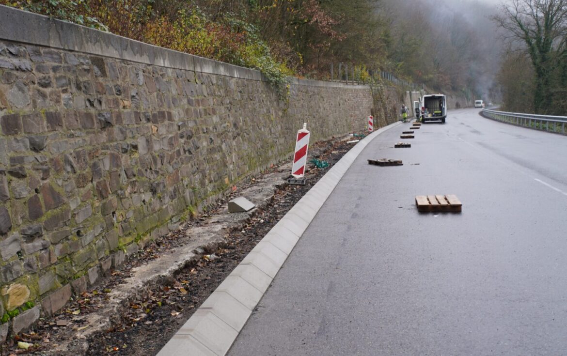 Übrigens ist die Sanierung wesentlich weiter fortgeschritten als heute in den sozialen Medien vermeldet wurde, die neue, dauerhaft installierte Ampel an der Friedrichssegener Brücke steht bereits, genauso wie die gesamte Leitplanke lahnseits und gut 80 Prozent der bergseitigen Leitplanke, auch die Vorarbeiten für die Markierungen sind zum größten Teil bereits erfolgt und sichtbar. Lediglich am Entwässerungsgraben und den Abläufen wird bergseits noch gearbeitet.