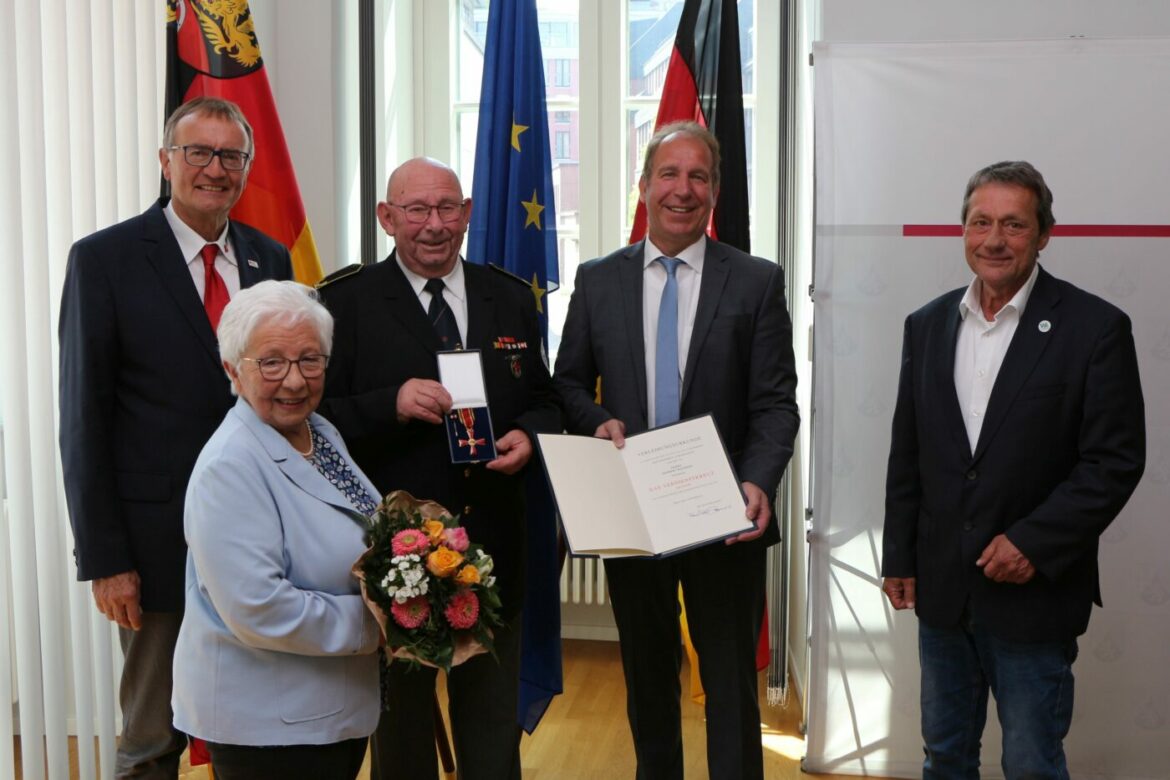 Westerburg | 04. Mai 2022 | (ms). Giesbert Wiethoff aus Westerburg im Westerwaldkreis ist mit dem Verdienstkreuz am Bande ausgezeichnet worden. Damit erhält der Westerwälder die höchste Anerkennung der Bundesrepublik Deutschland für Verdienste um das Gemeinwohl. Ausgezeichnet wurde Wiethoff für die vergangenen fast sechzig Jahre, in denen er sich weit über dem üblichen Maße für seine Mitmenschen, das Deutsche Rote Kreuz und den Katastrophenschutz engagiert hatte. Bei der Feierstunde in Mainz sagte Staatssekretär Stich, der die Auszeichnung im Namen von Bundespräsident Frank-Walter Steinmeier durchführte, dass sich Wiethoff die Anerkennung sowohl durch seinen ehrenamtlichen als auch seinem hauptberuflichen Engagement redlich verdient hat. “Giesbert Wiethoff war nicht nur an unzähligen Einsätzen des DRK und des Katastrophenschutzes beteiligt, sondern setzt sich seit Jahren aktiv für die Verbreitung der Geschichte und Idee hinter der Rotkreuzbewegung und der Genfer Konvention ein. Dieses Engagement verdient höchsten Respekt“, würdigte Staatssekretär Stich den Geehrten.