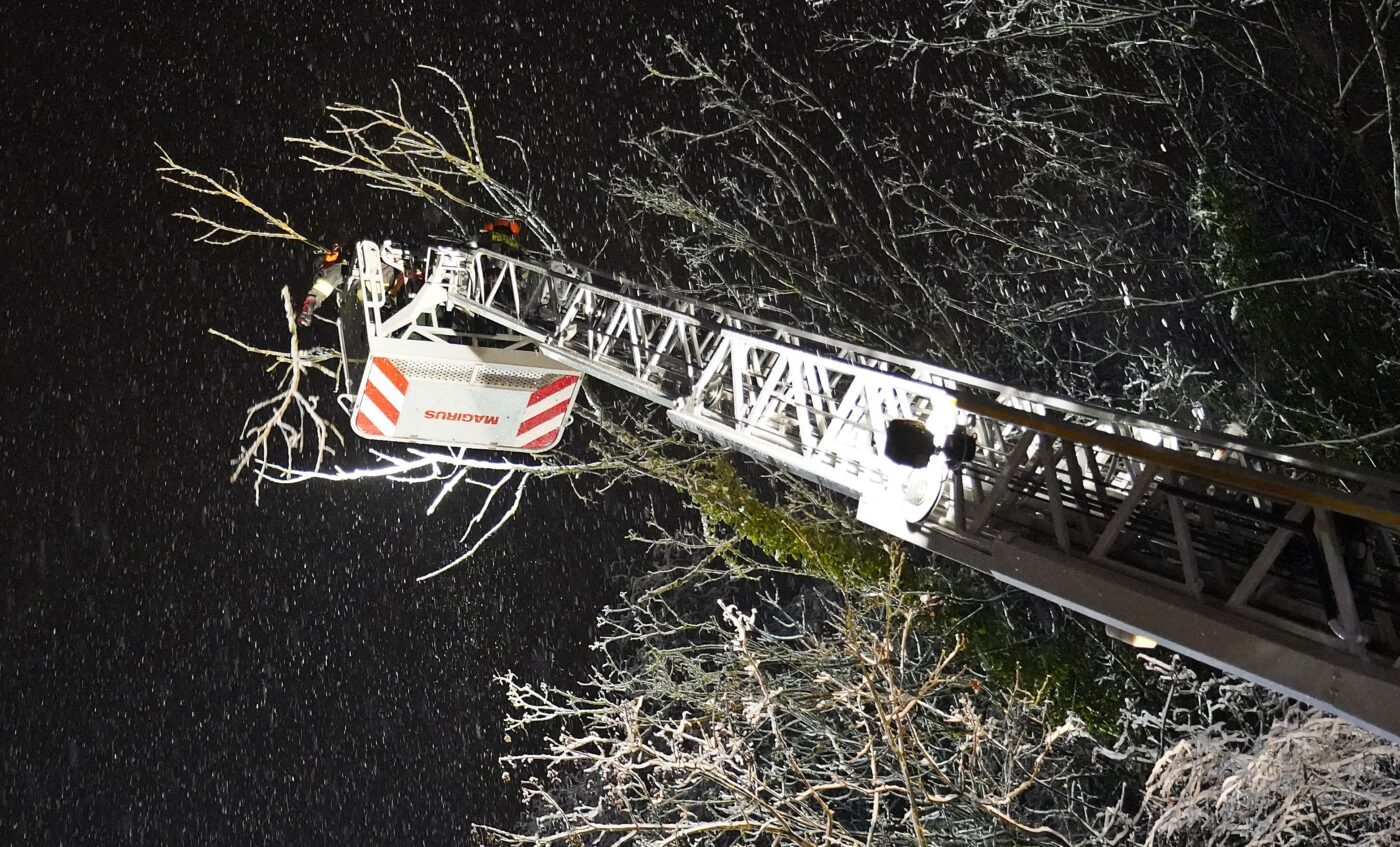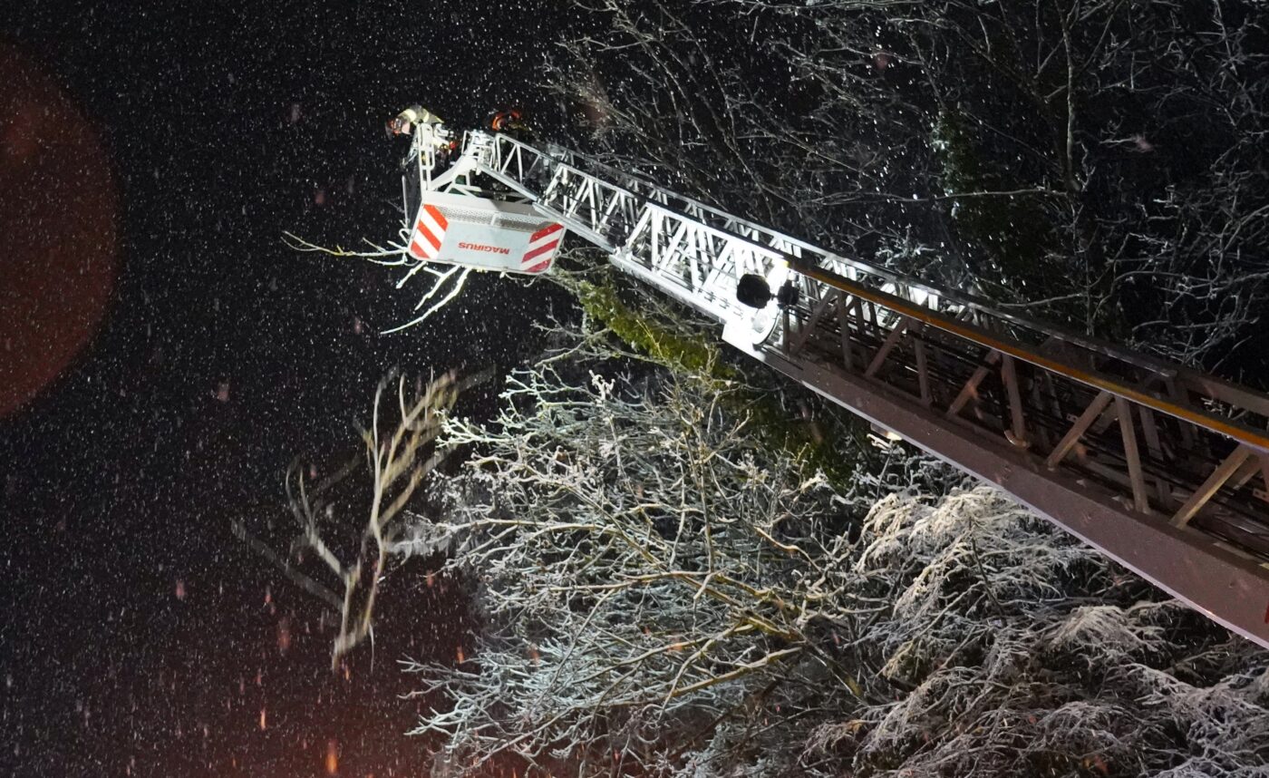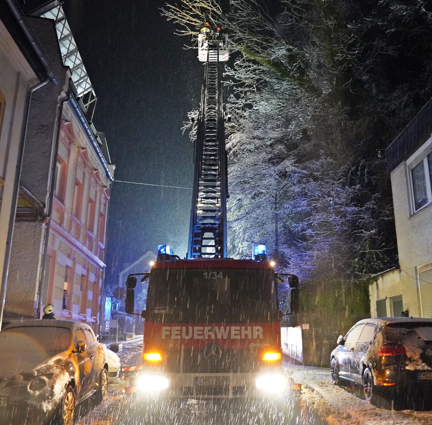 Einen Einsatz haben wir dann doch noch stellvertretend für euch verfolgt: in der Braubacher Straße hatte die Schneelast einen Baum abknicken lassen, der nun in ein Haus und auf die Straße zu stürzen drohte. Nach der Sperrung der wichtigen Verbindung konnte der abgeknickte Baum von der Drehleiter aus in luftiger Höhe Stück für Stück gekürzt und die Gefahr so gebannt werden. Die Bilder von diesem Einsatz stehen damit stellvertretend für hunderte von Einsätzen von ehrenamtlichen und hauptberuflichen Rettungskräften an einem sehr chaotischen winterlichen Tag.