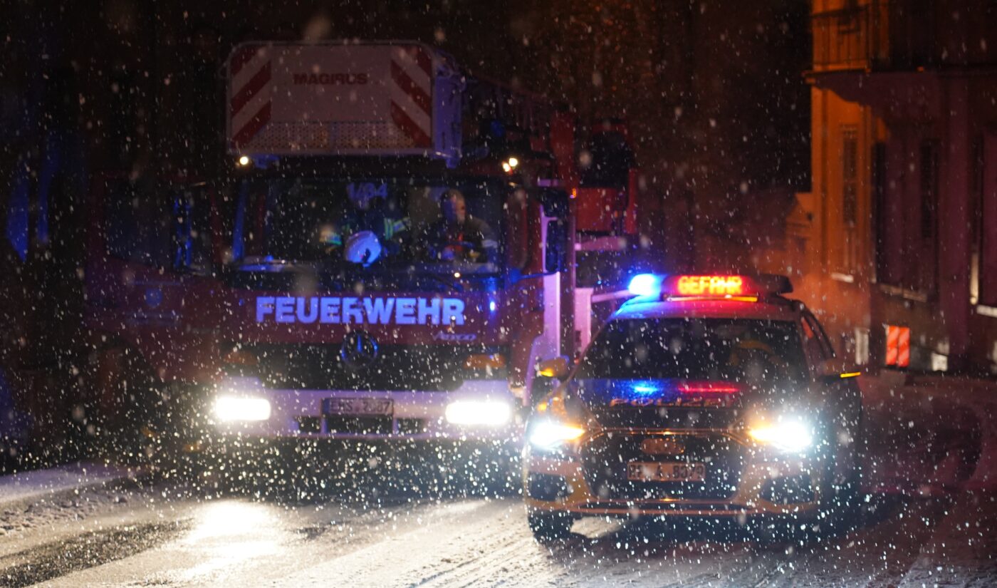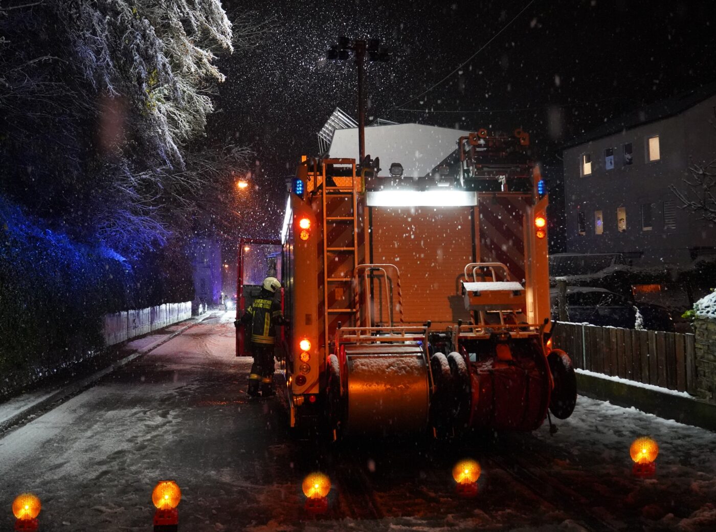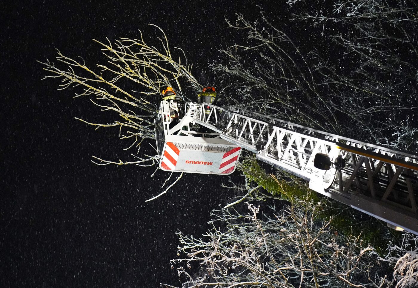 Einen Einsatz haben wir dann doch noch stellvertretend für euch verfolgt: in der Braubacher Straße hatte die Schneelast einen Baum abknicken lassen, der nun in ein Haus und auf die Straße zu stürzen drohte. Nach der Sperrung der wichtigen Verbindung konnte der abgeknickte Baum von der Drehleiter aus in luftiger Höhe Stück für Stück gekürzt und die Gefahr so gebannt werden. Die Bilder von diesem Einsatz stehen damit stellvertretend für hunderte von Einsätzen von ehrenamtlichen und hauptberuflichen Rettungskräften an einem sehr chaotischen winterlichen Tag.